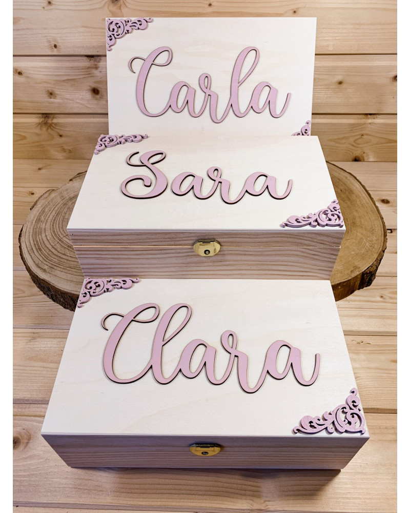 Cofre de madera natural personalizado con nombre y esquinas de madera balsa pintadas.